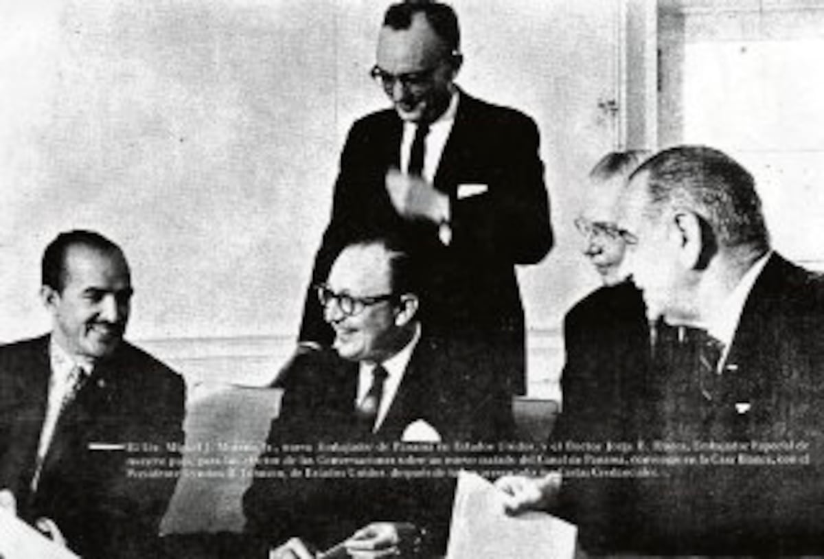 Imagen: Firma del acuerdo entre Miguel J. Moreno Jr. y Ellsworth Bunker en la OEA, 1964. Fuente: La Prensa.